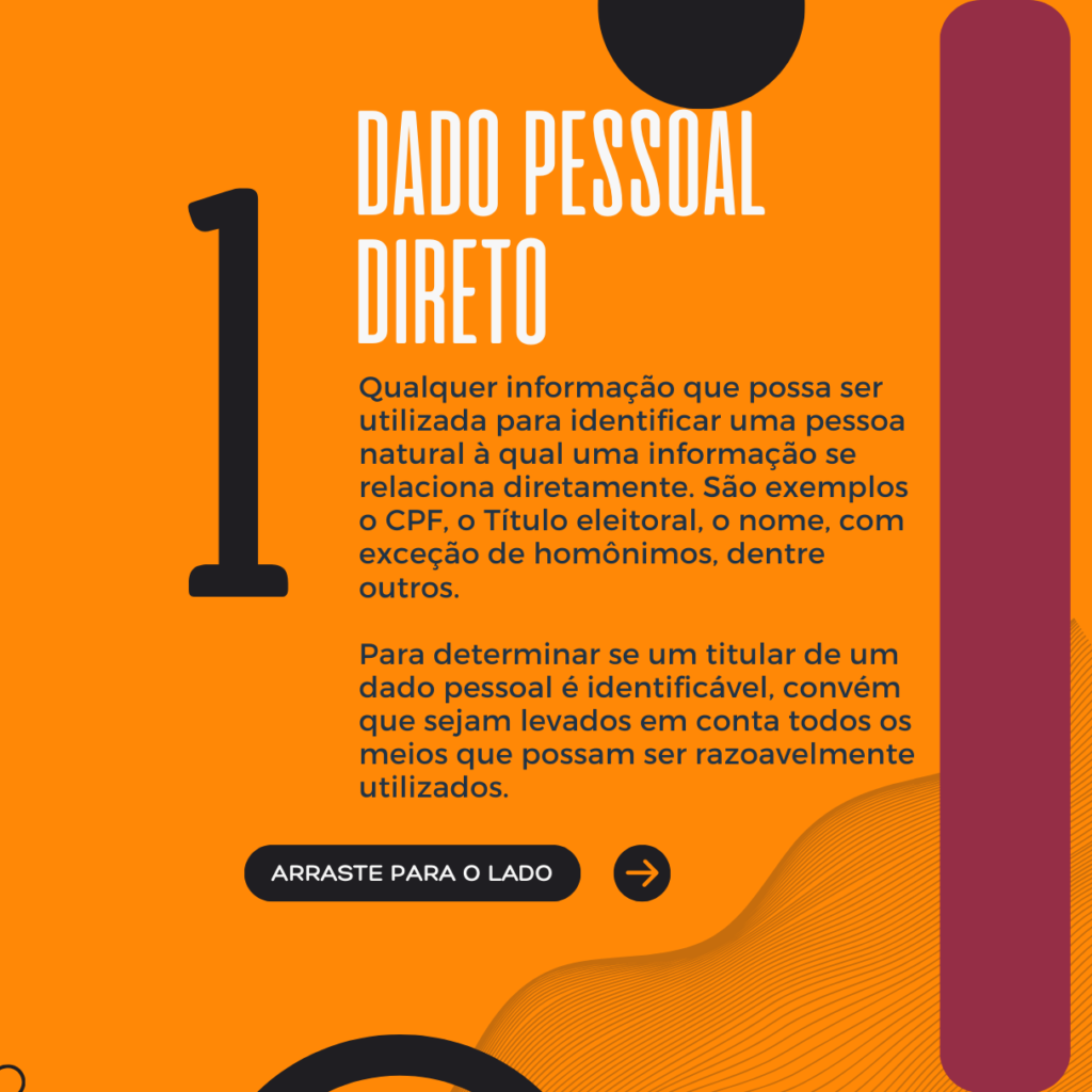 Qualquer informação que possa ser utilizada para identificar uma pessoa natural à qual uma informação se relaciona diretamente. São exemplos o CPF, o Título eleitoral, o nome, com exceção de homônimos, dentre outros. Para determinar se um titular de um dado pessoal é identificável, convém que sejam levados em conta todos os meios que possam ser razoavelmente utilizados.