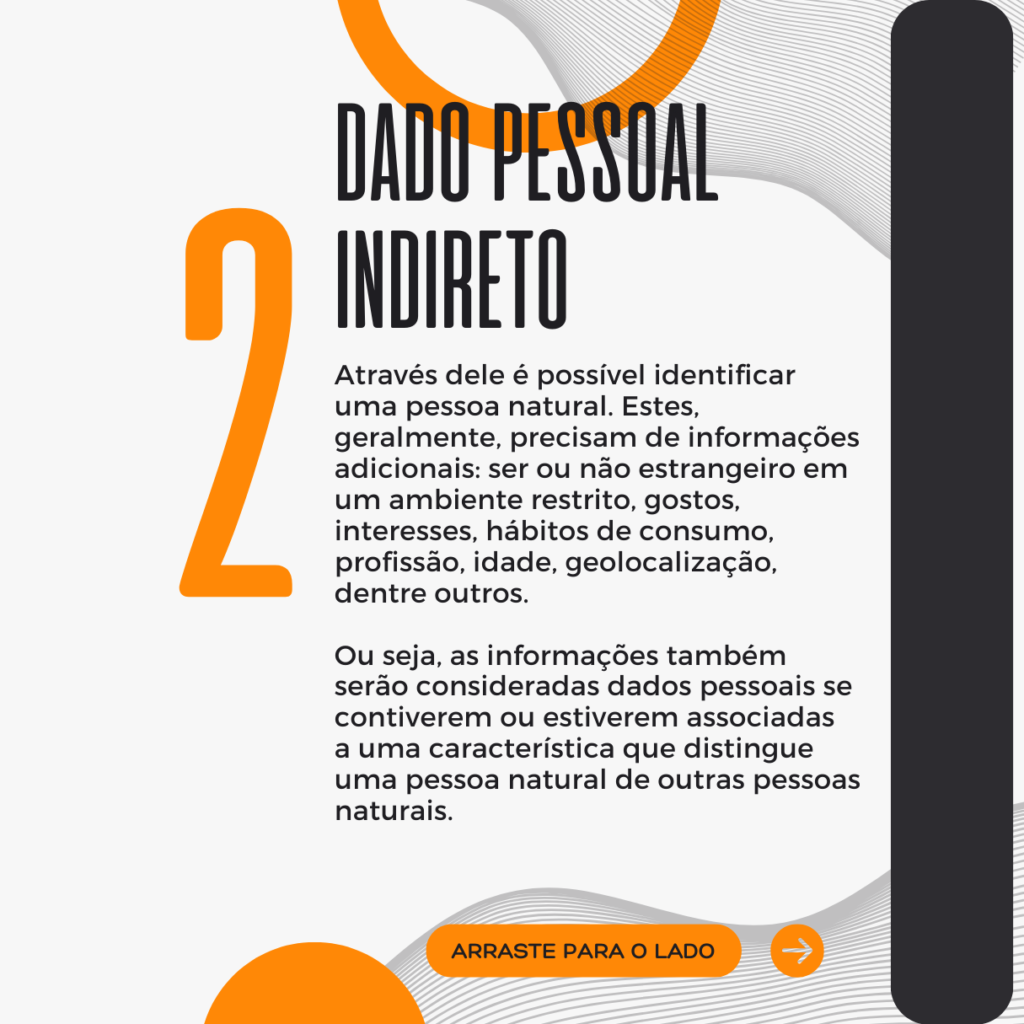 Através dele é possível identificar uma pessoa natural. Estes, geralmente, precisam de informações adicionais: ser ou não estrangeiro em um ambiente restrito, gostos, interesses, hábitos de consumo, profissão, idade, geolocalização, dentre outros. Ou seja, as informações também serão consideradas dados pessoais se contiverem ou estiverem associadas a uma característica que distingue uma pessoa natural de outras pessoas naturais.