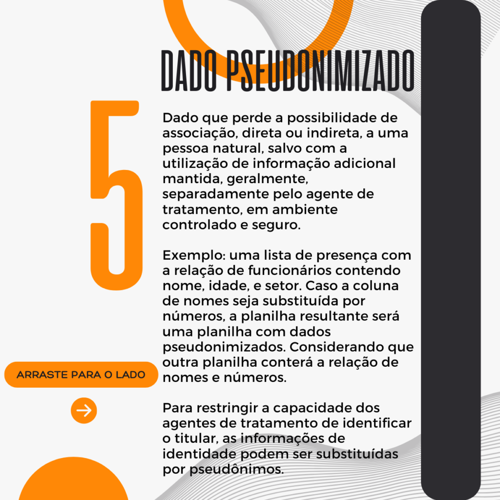 Dado que perde a possibilidade de associação, direta ou indireta, a uma pessoa natural, salvo com a utilização de informação adicional mantida, geralmente, separadamente pelo agente de tratamento, em ambiente controlado e seguro. Exemplo: uma lista de presença com a relação de funcionários contendo nome, idade, e setor. Caso a coluna de nomes seja substituída por números, a planilha resultante será uma planilha com dados pseudonimizados. Considerando que outra planilha conterá a relação de nomes e números. Para restringir a capacidade dos agentes de tratamento de identificar o titular, as informações de identidade podem ser substituídas por pseudônimos.