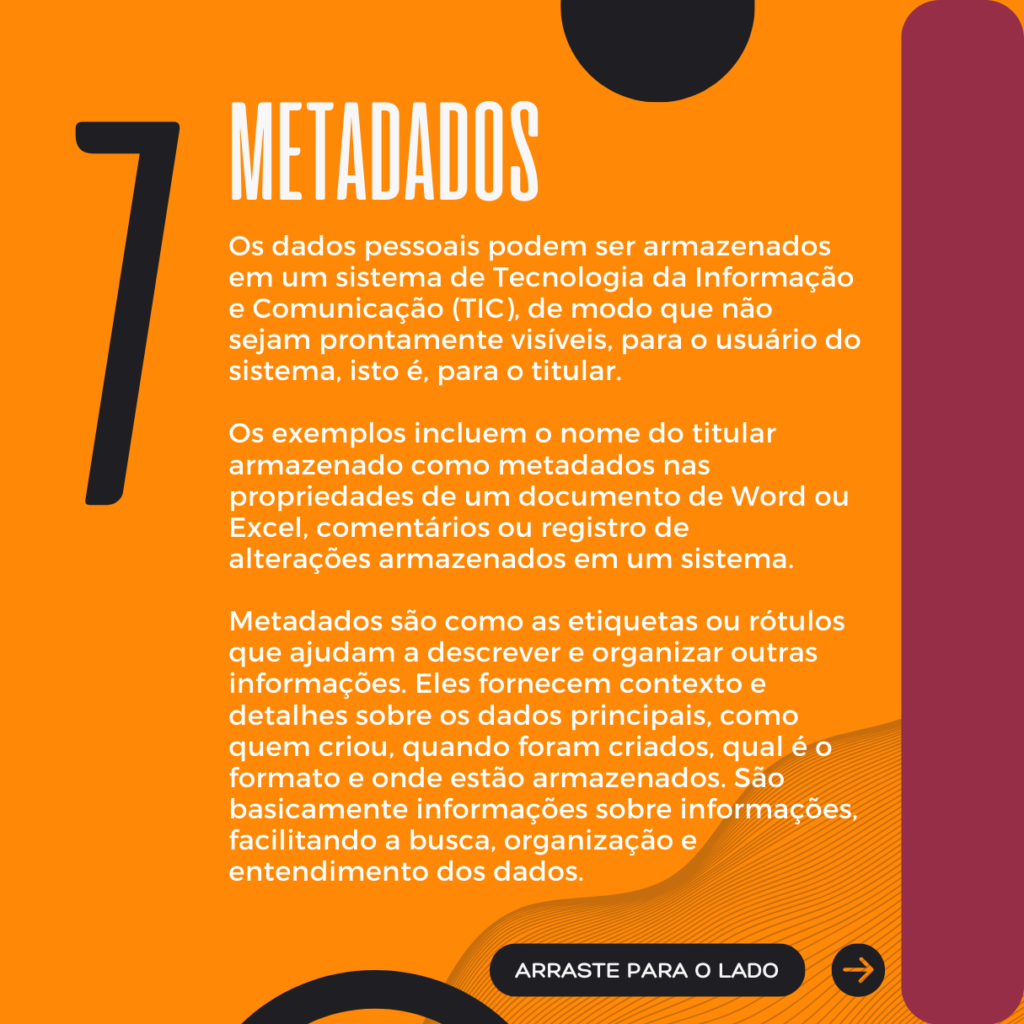 Os dados pessoais podem ser armazenados em um sistema de Tecnologia da Informação e Comunicação (TIC), de modo que não sejam prontamente visíveis, para o usuário do sistema, isto é, para o titular. Os exemplos incluem o nome do titular armazenado como metadados nas propriedades de um documento de Word ou Excel, comentários ou registro de alterações armazenados em um sistema. Metadados são como as etiquetas ou rótulos que ajudam a descrever e organizar outras informações. Eles fornecem contexto e detalhes sobre os dados principais, como quem criou, quando foram criados, qual é o formato e onde estão armazenados. São basicamente informações sobre informações, facilitando a busca, organização e entendimento dos dados.